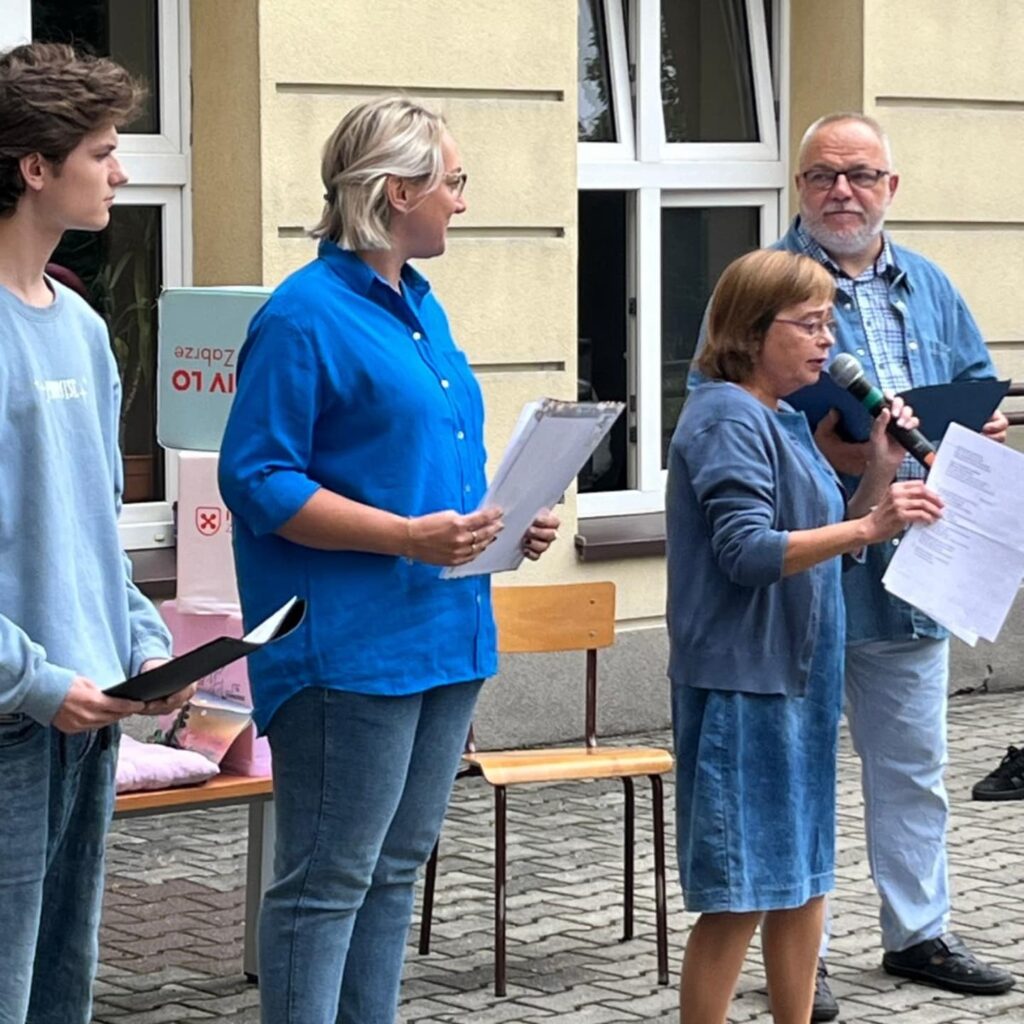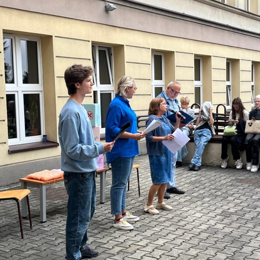 W poniedziałek 8 września zaproszono uczniów wszystkich klas wraz z opiekunami na taras szkoły gdzie wysłuchali utworów: fraszki, pieśni oraz trenu XVIII w wykonaniu nauczycieli: bibliotekarza, polonisty, nauczyciela wspomagającego oraz Kacpra ucznia klasy 4D. Obsługą sprzętu zajął się Sebastian z klasy 4D. Dziękujemy i zachęcamy do odkrywania na nowo poezji Jana Kochanowskiego.