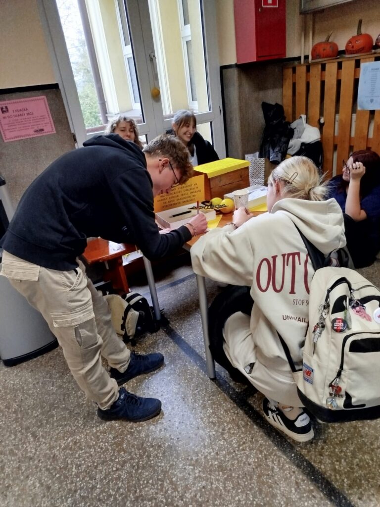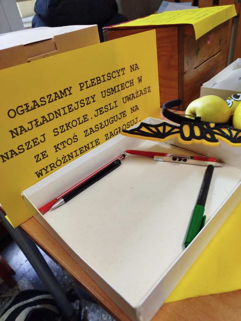 W piątek 21 listopada Dzień Życzliwości odbył się w naszej szkole. Poprosiliśmy o akcenty w kolorze żółtym i rozwiązywanie zadań w klasach. Na korytarzu na specjalnie przygotowanym stanowisku stała skrzyneczka do której można było wrzucać bileciki i liściki dla innych osób. Odbył się też plebiscyt na najpiękniejszy uśmiech w naszej szkole.
