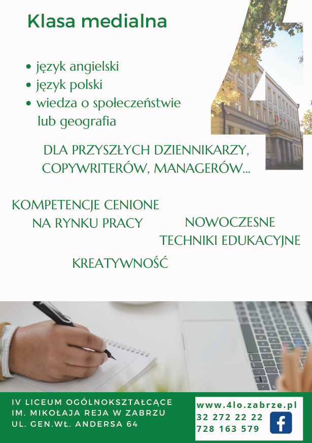 W naszej ofercie edukacyjnej znalazła się też klasa dla humanistów. Wszyscy Ci, którzy myślą aby w przyszłości związać swoją ścieżkę zawodową z językiem pisanym czy mówionym, ze sferą artystyczną, czy teatralną, są ekspresyjni i gotowi na udział w różnych przedsięwzięciach – to ta klasa jest dla Nich! W klasie medialnej integracyjnej uczniowie będą realizować rozszerzenie z języka angielskiego lub niemieckiego do wyboru, kolejno z języka polskiego oraz historii lub geografii do wyboru.